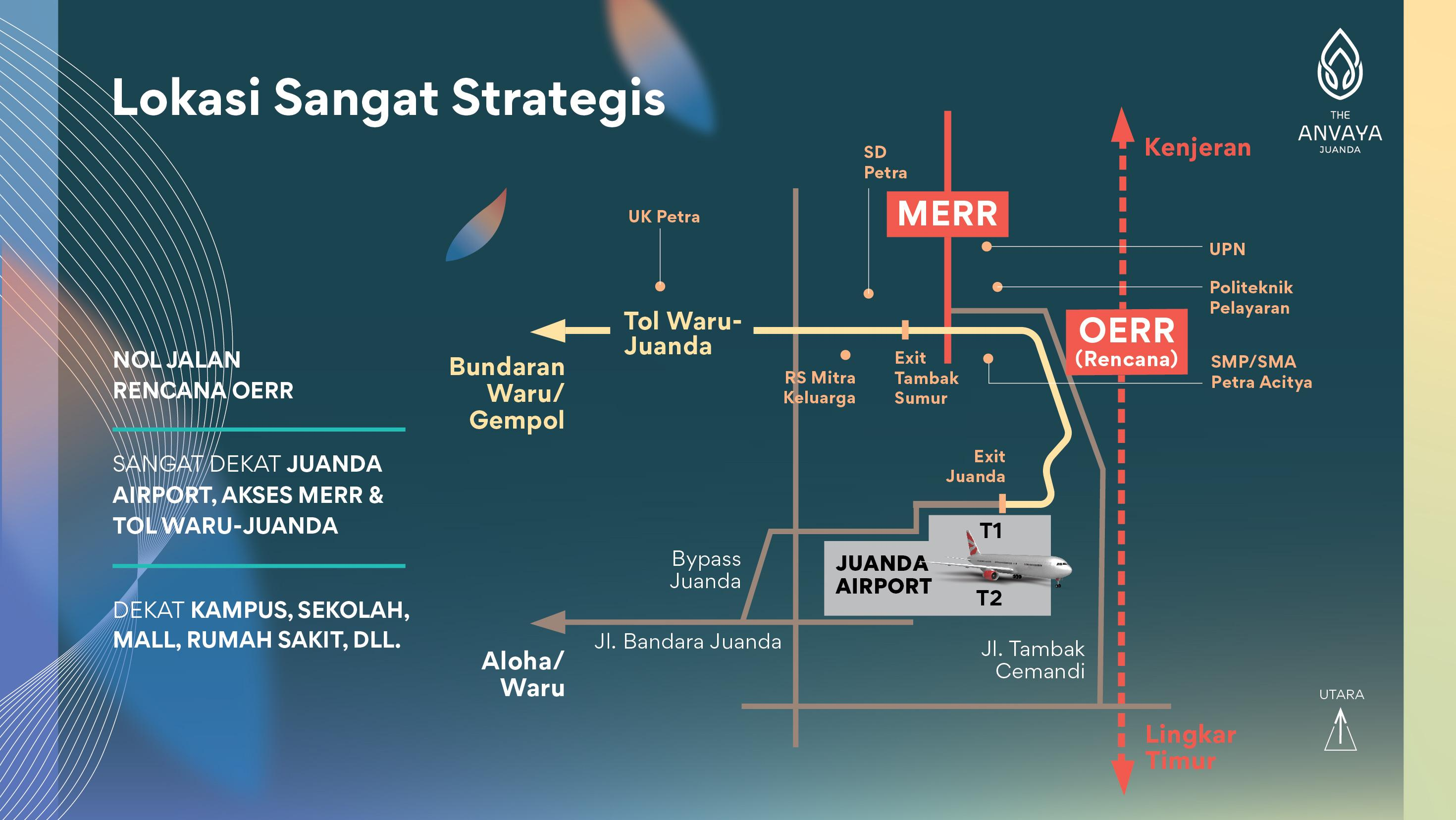 The Anvaya Juanda merupakan perumahan yang berlokasi di Sedati, Sidoarjo. Anvaya Juanda menawarkan berbagai tipe rumah yang modern minimalis, menggunakan bahan material berkualitas, fasilitas lengkap, dan hunian nyaman untuk keluarga Anda. Dengan memiliki rumah di Anvaya Juanda, Anda akan mendapatkan keuntungan lokasi seperti: • Rumah dekat bandara Juanda • Rumah dekat tol Sidoarjo-Waru dan akses tol Tambak Sumur • Rumah dekat kawasan industri Sidoarjo-Surabaya • Rumah dekat pusat perbelanjaan, SMP/SMA, perguruan tinggi, rumah sakit dan fasilitas umum lainnya. Fasilitas yang tersedia di Anvaya Juanda antara lain: • Cluster Gate, Aerial View, Outdoor Gym, Children Playground, Taman Baca, Basketball Court. • Lakeview Garden, Lakeview & Mini Amphitheater Park, Lakeview Garden & Deck, Kids Playground, Outdoor Gazebo & Picnic Area, Hanging Garden & Jogging Park, Vertical Garden, Reflexology & Study Park, Calisthenic Park. Dengan harga yang terjangkau serta berbagai kemudahan pembayaran, Anvaya Juanda adalah pilihan tepat untuk Anda yang mencari hunian di Sidoarjo. ✔ Subsidi DP 0 Rupiah, pembayaran awal lebih ringan. ✔ Gratis biaya BPHTB, BBN, AJB, dan fasilitas tandon bawah. ✔ Subsidi biaya administrasi dan asuransi hingga Rp 20 Juta. ✔ Subsidi cicilan pembelian rumah sebesar Rp 1.200.000/bulan selama 1 tahun.